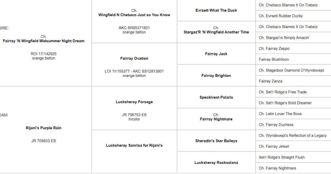 Sire: Ch Fairray 'N Wingfield Midsummer Night Dream